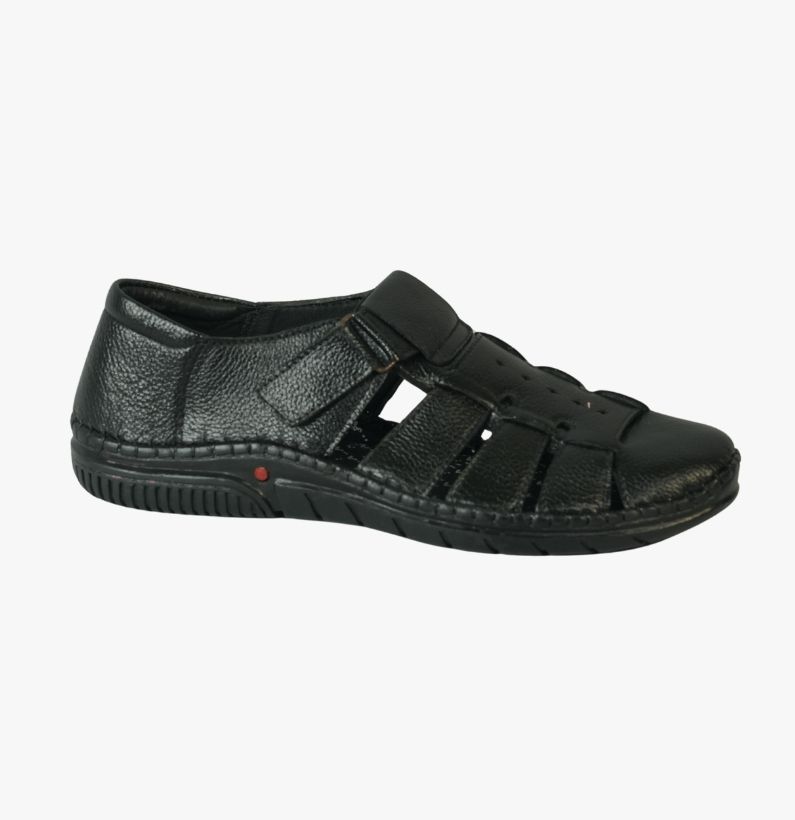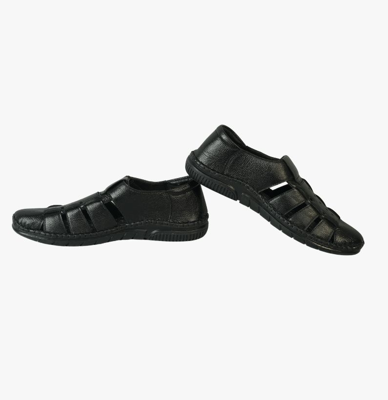 Premium black leather Sacchi designed with breathable cut-outs, full toe protection, and a flexible anti-slip sole. Ideal for daily use, summer comfort, and long walking support.