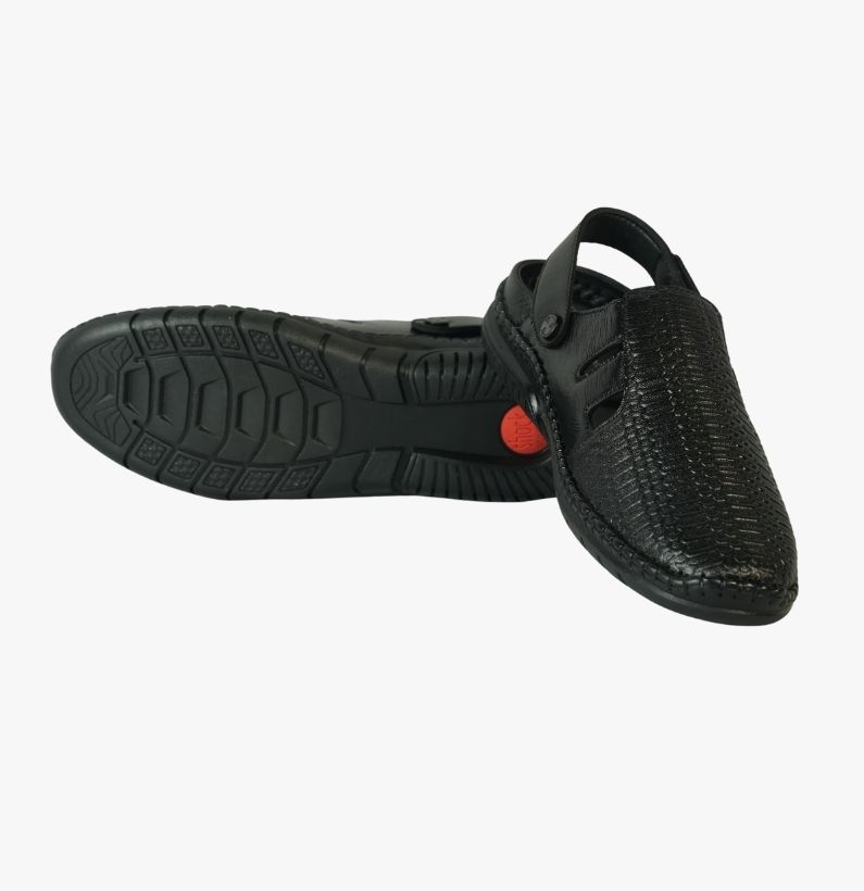 Premium black leather Sacchi with open-side ventilation, textured upper, slingback strap, and durable anti-slip sole. Ideal for daily wear, summer comfort, and long walking support.