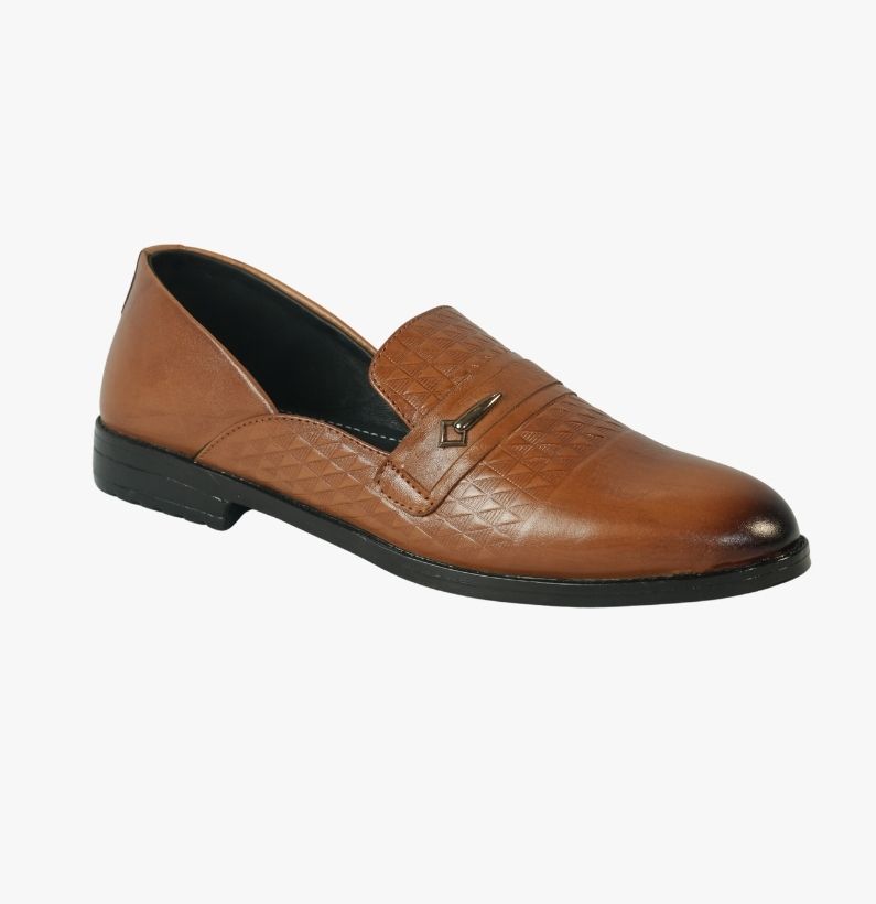 Elegant brown leather loafers featuring premium textured detailing and a sleek metal accent. Lightweight, stylish, and perfect for formal, semi-formal, and festive occasions.