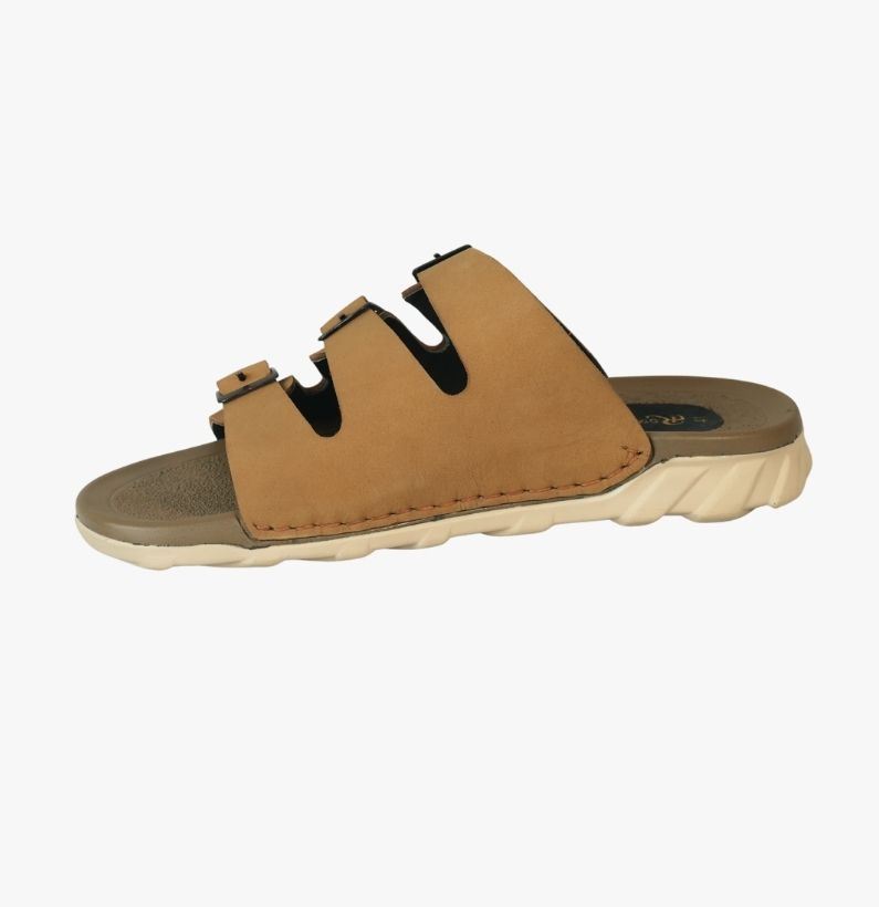 Soft tan leather sandal with three adjustable straps, cushioned footbed, and flexible lightweight sole. Ideal for casual daily use, home wear, and summer comfort.